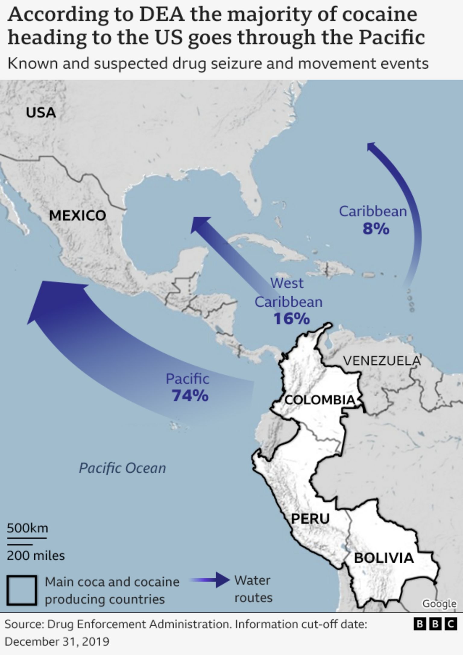 წყნარ ოკეანეში სულ მცირე ოთხი დარტყმა მოხდა, რაც ბევრად უფრო მნიშვნელოვანი ნარკოტიკების ტრაფიკინგის დერეფანია, დანარჩენი კი კარიბის ზღვის აუზში.