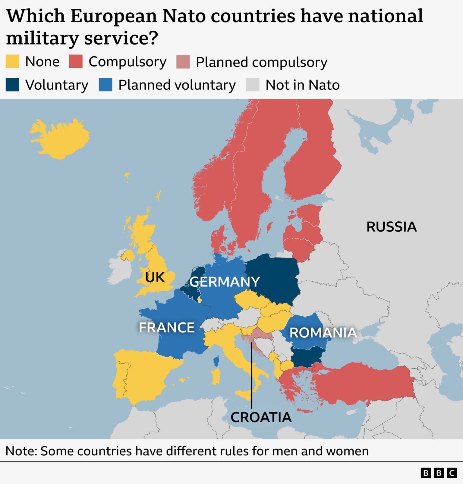 ევროპის ზოგიერთი უდიდესი ნატოს წევრი გადადის პროფესიონალური არმიების გაძლიერებაზე ნებაყოფლობითი ეროვნული სამსახურის სქემების მეშვეობით. ცივი ომის დროს ნატოს სახელმწიფოებში დიდი რაოდენობით გაწვეული ჯარები იყო, მაგრამ საბჭოთა კავშირის დაშლის შემდეგ მათი რაოდენობა შემცირდა. თუმცა, 2022 წელს რუსეთის სრულმასშტაბიანი შეჭრა უკრაინაში და იქ მიმდინარე ომი შიშს იწვევს ნატოს შესაძლო მომავალი თავდასხმის შესახებ. აქ ჩვენ განვიხილავთ, თუ როგორ ვითარდება ეს ახალი რეკრუტირების კამპანია ნატოს 30 ევროპულ წევრ სახელმწიფოს შორის, რომელთაგან ბევრს ჯერ კიდევ ჰყავს გაწვეული არმია. გაწვევა მოქმედებს ნატოს ცხრა ევროპულ სახელმწიფოში: დანია, ესტონეთი, ფინეთი, საბერძნეთი, ლატვია, ლიტვა, ნორვეგია, შვედეთი და თურქეთი. თურქეთში, რომელსაც უსაფრთხოების ალიანსში აშშ-ს შემდეგ სიდიდით მეორე სამხედრო ჰყავს, 20-დან 41 წლამდე ასაკის მამაკაცები ვალდებულნი არიან იმსახურონ სამხედრო სამსახურში ექვსიდან 12 თვემდე. ამის საპირისპიროდ, ნორვეგია ორივე სქესს იძახებს, ზოგადად 12 თვის განმავლობაში. ხორვატია გეგმავს მომავალ წელს ხელახლა შემოიღოს გაწვევა - სავალდებულო იქნება 19-დან 29 წლამდე ასაკის მამაკაცებისთვის, გაიარონ ორი თვე ძირითადი სამხედრო მომზადება. სხვა ნატოს წევრები არ იძახებენ, არამედ ჰყავთ პროფესიონალური სამხედროები. დიდ ბრიტანეთს, რომელსაც აქვს ჩვეულებრივი სამხედრო ძალა, რომელიც კონკურენციას უწევს საფრანგეთს ან გერმანიას (და არის ნატოს ერთადერთი სახელმწიფო ევროპაში საფრანგეთთან ერთად, რომელსაც აქვს ბირთვული იარაღი), ეყრდნობა პროფესიონალურ არმიას. ის უნიკალურია ნატოს წევრებს შორის არასრულწლოვანთა რეკრუტირებისთვის - 16 წლის მოზარდებს შეუძლიათ გაწევრიანება მშობლის თანხმობით. ალბანეთს, ჩეხეთს, უნგრეთს, იტალიას, ლუქსემბურგს, მონტენეგროს, ჩრდილოეთ მაკედონიას, პორტუგალიას, სლოვაკეთს, სლოვენიასა და ესპანეთს ასევე ჰყავთ პროფესიონალური სამხედროები. ისლანდიას არ ჰყავს რეგულარული სამხედრო ძალები, თუმცა მისი სანაპირო დაცვა ასრულებს ზოგიერთ თავდაცვის ამოცანას. https://ichef.bbci.co.uk/news/1536/cpsprodpb/4774/live/46d5eab0-d201-11f0-9fb5-5f3a3703a365.png მხოლოდ ამ თვეში, ბელგიის თავდაცვის სამინისტრომ 17 წლის ახალგაზრდებს გაუგზავნა წერილები, რათა მოეწვიათ ისინი მოხალისეებად დაახლოებით 2000 ევროდ თვეში. მოხალისეთა სამხედრო სამსახურის სქემა, რომელიც მომავალ წელს დაიწყება, მიზნად ისახავს არმიის რეზერვისტების რაოდენობის გაზრდას დაახლოებით 6000-დან 20000-მდე. ბელგიის მეზობელმა, ნიდერლანდებმა, 2023 წელს წამოიწყო ნებაყოფლობითი ს