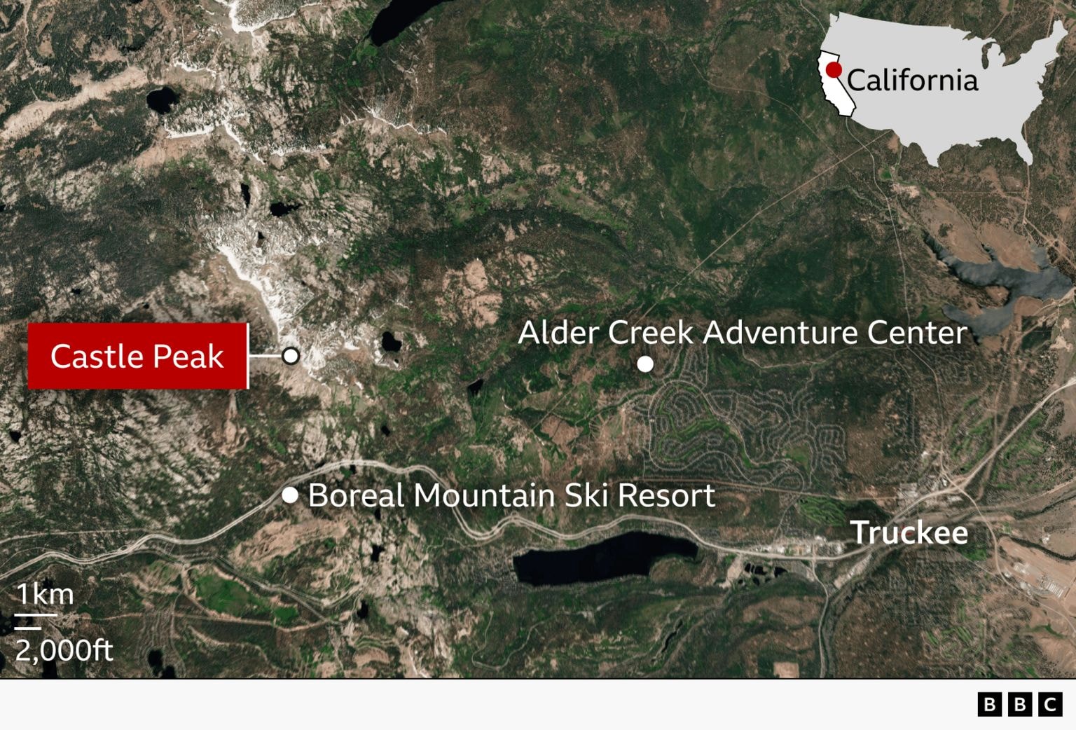 ზვავი დაფიქსირდა დაახლოებით 11:30 PST (19:30 GMT) Castle Peak-ის ტერიტორიაზე, ქალაქ Truckee-სთან ახლოს, ოფიციალური პირების ცნობით. ამინდის პირობები კვლავ საშიშია, ზვავის შემდგომი მაღალი შანსით.